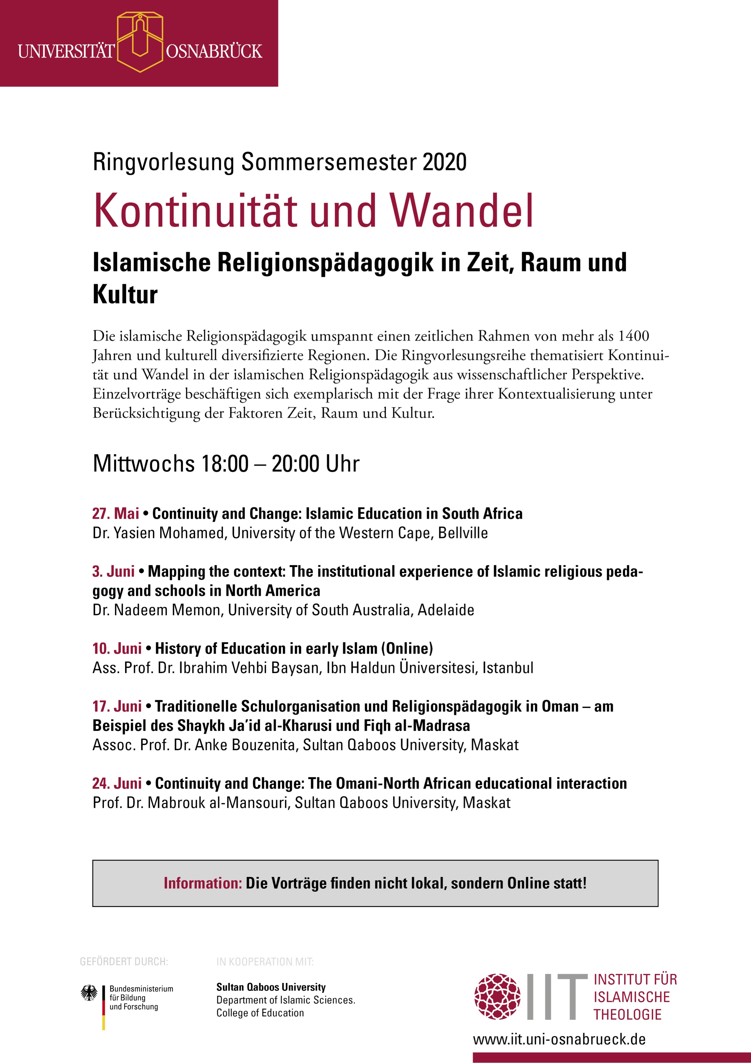 Die islamische Religionspädagogik umspannt einen zeitlichen Rahmen von mehr als 1400 Jahren und kulturell diversifizierte Regionen. Die Ringvorlesungsreihe thematisiert Kontinuität und Wandel in der islamischen Religionspädagogik aus wissenschaftlicher Perspektive. Einzelvorträge beschäftigen sich exemplarisch mit der Frage ihrer Kontextualisierung unter Berücksichtigung der Faktoren Zeit, Raum und Kultur.