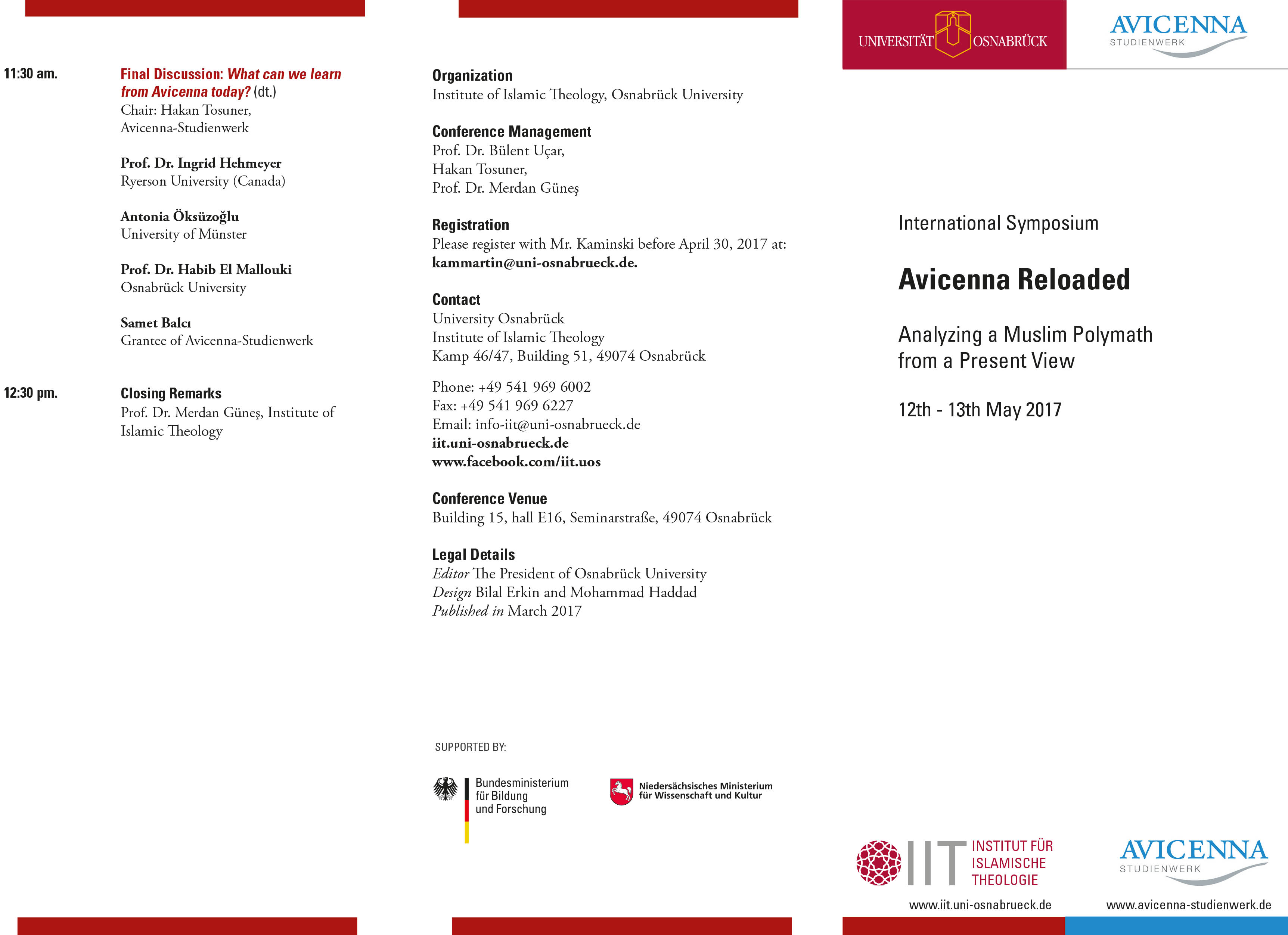 Das Institut für Islamische Theologie der Universität Osnabrück veranstaltete zusammen mit dem Avicenna-Studienwerk ein internationales Symposium zur historischen Person Avicenna und brachte Akademiker/innen und Expert/innen aus der ganzen Welt zusammen. Dadurch wurde eine Plattform für den Ideenaustausch, für die Präsentation und Diskussion aktueller Forschungen sowie für die Entwicklung neuer Forschungsansätze aus interdisziplinärer Sicht geschaffen. Das Symposium beleuchtete das Leben, Werk und Wirken der Person Avicenna aus philosophischer, theologischer, medizinischer, psychologischer, astronomischer und naturwissenschaftlicher Sicht